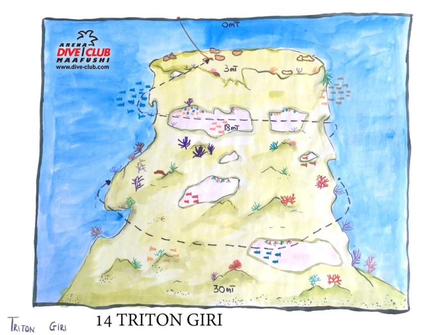 Triton Giri es un pequeño arrecife redondo dentro del atolón que ofrece un buceo agradable y relajado. En una sección del giri hay una pequeña cueva con muchas peces cristal dentro de ella. Es un lugar hermoso para el buceador que está entusiasmado por encontrar pequeñas criaturas como nudibranquios, gusanos planos o muchos tipos diferentes de camarones. El buceador afortunado incluso podría encontrar un raro pez rana. Pero también se pueden ver muchos fusileros, varias jureles, a veces atunes y tortugas.